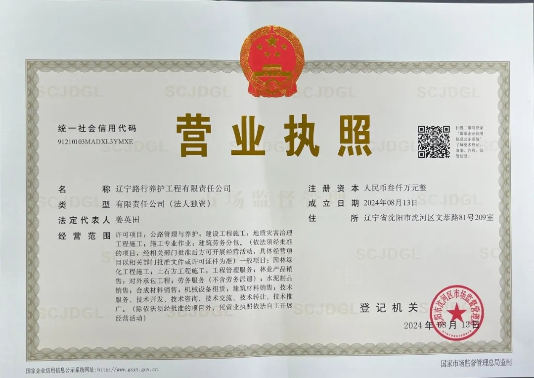 8月13日,养护公司下属辽宁路行养护工程有限责任公司(以下简称“路行公司”)完成工商注册,取得营业执照,标志着养护公司旗下继科技养护公司、大通公司、智信公司后,第4家子公司正式成立。